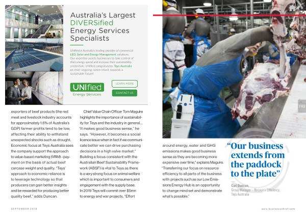 UNIfied is Australia ’ s leading provider of commercial LED , Solar and Energy Management solutions . Our expertise assists businesses to take control of their energy spend and increase their sustainability credentials . UNIfied congratulates Teys Australia on their ongoing commitment towards a sustainable future !