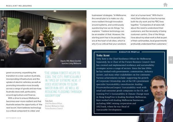 Toby Kent is the Chief Resilience Officer for Melbourne . Separately , he is Chair of the Future Business Council . Kent has created and implemented resilience and sustainability strategies across a range of sectors . Since the late 1990s he has worked with governments , communities , industry sectors , and many other stakeholders on five continents Various achievements include : supporting the growth of Corporate Citizenship , one of the UK ’ s preeminent specialist Sustainability consultancies ; leading PricewaterhouseCoopers ’ Sustainability work with retail and consumer goods companies in the UK ; and running PwC ’ s Sustainability & Climate Change team in Hong KongPrior to leading Resilient Melbourne , Kent worked with leading Melbourne businesses , including MMG mining corporation and ANZ bank , where he was Head of Sustainable Development .
