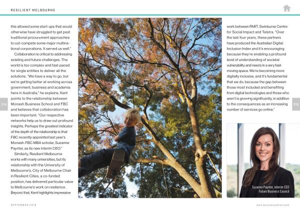 Collaboration is critical to addressing existing and future challenges . The world is too complex and fast-paced for single entities to deliver all the solutions . “ We have a way to go , but we ’ re getting better at working across government , business and academia here in Australia ,” he explains . Kent points to the relationship between Monash Business School and FBC and believes that collaboration has been important . “ Our respective networks help us to draw out profound insights . Perhaps the greatest indicator of the depth of the relationship is that FBC recently appointed last year ’ s Monash-FBC MBA scholar , Suzanne Paynter , as its new interim CEO .”