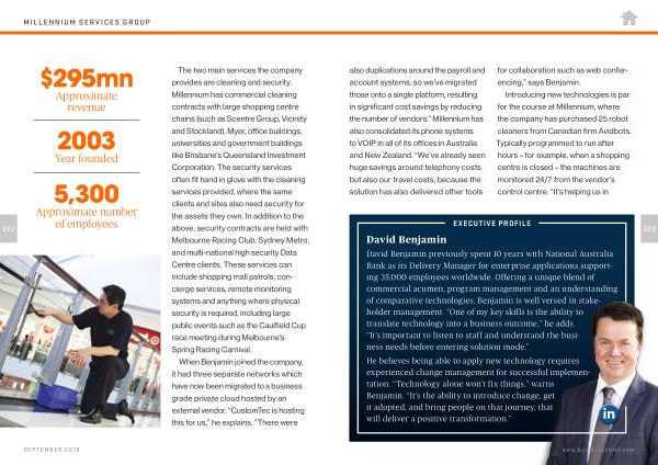 The two main services the company provides are cleaning and security . Millennium has commercial cleaning contracts with large shopping centre chains ( such as Scentre Group , Vicinity and Stockland ), Myer , office buildings , universities and government buildings like Brisbane ’ s Queensland Investment Corporation . The security services often fit hand in glove with the cleaning services provided , where the same clients and sites also need security for the assets they own . In addition to the above , security contracts are held with Melbourne Racing Club , Sydney Metro , and multi-national high security Data Centre clients . These services can include shopping mall patrols , concierge services , remote monitoring systems and anything where physical security is required , including large public events such as the Caulfield Cup race meeting during Melbourne ’ s Spring Racing Carnival .