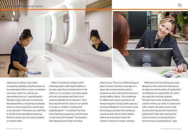 Millennium isn ’ t just flying solo says Benjamin , who notes the importance of alliances with the likes of CustomTec and Melbourne-based Elite-ID , which provides the tracking systems . “ We also have a site auditing software solution where our staff , in conjunction with a client , will walk around a site to document issues that need to be addressed , while also scoring how clean an area is , ensuring that our service is up to expectations ,” says
