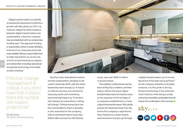 Digital transformation is evidently of paramount importance to SkyCity ’ s growth with McLatchie as CIO . It is , however , integral to strike a balance between digital transformation and sustainability , a feat the company has accomplished with no compromise on either part . “ Our approach to being a responsible citizen is quite detailed , in terms of our corporate and social responsibility . Being a responsible host is really important to us ; we do a lot of work around ensuring our players are looked after , including using facial recognition technology and mobile location tracking .”