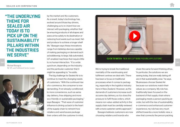 share the same forward-thinking ethos . “ In particular , the solutions we are seeing today , that are really taking off are in that sustainability area .” he says . “ Businesses choose Sealed Air because our solutions match their values as a company . My role has traditionally been focused on the backend of that supply chain where packaging meets a person packing an order , but with the rise of sustainability , e-commerce and enhanced customer experience , my role has very much shifted towards a more holistic view , a view that connects the person packing
