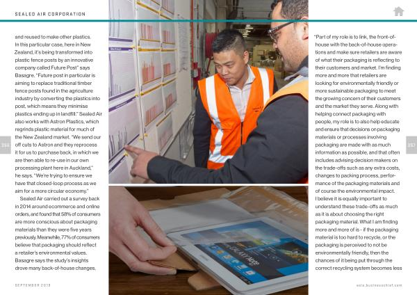 356 and reused to make other plastics . In this particular case , here in New Zealand , it ’ s being transformed into plastic fence posts by an innovative company called Future Post ” says Basagre . “ Future post in particular is aiming to replace traditional timber fence posts found in the agriculture industry by converting the plastics into post , which means they minimise plastics ending up in landfill .” Sealed Air also works with Astron Plastics , which regrinds plastic material for much of the New Zealand market . “ We send our off cuts to Astron and they reprocess it for us to purchase back , in which we are then able to re-use in our own processing plant here in Auckland ,” he says . “ We ’ re trying to ensure we have that closed-loop process as we aim for a more circular economy .”