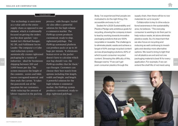 “ Our technology is seen more as a value add to the entire supply chain as opposed to one element , which is traditionally focused on getting the orders out the door quicker ,” says Sealed Air ’ s Michael Basagre , NZ 3PL and Fulfilment Sector Leader . The company ’ s e-Cube void-reduction system automatically creates rightsized packaging for a variety of industries – ideal for businesses shipping between 300 and 3,000 boxes per day . The system measures the height of the contents , scores and folds excess corrugated material and then seals the carton . “ It takes the guesswork out of the equation for our customers , while reducing the amount of labour required in the packing process ,” adds Basagre . Sealed Air also offers a powerful solution for the high-volume e-commerce market . The FloWrap system produces customised , ready-to-ship , rightsized polybags . The FloWrap automated platform can produce packs at up to 30 bags per minute , “ It eliminates human error as the packer doesn ’ t have to calculate which size bag should I use , the FloWrap enables that for them ,” says Basagre . Customers can choose their best match from options including film length , width and height , and length . A powerful solution for the high-volume e-commerce market , the FloWrap system produces customised , ready-toship , rightsized polybags