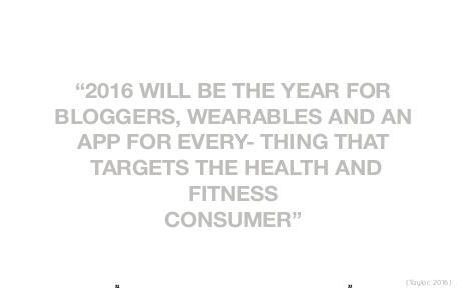 “2016 WILL BE THE YEAR FOR BLOGGERS, WEARABLES AND AN APP FOR EVERY- THING THAT TARGETS THE HEALTH AND FITNESS CONSUMER” 32 33 (Taylor, 2016)