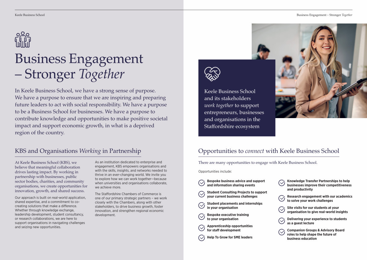 Keele Business School and its stakeholders work together to support entrepreneurs , businesses and organisations in the Staffordshire ecosystem