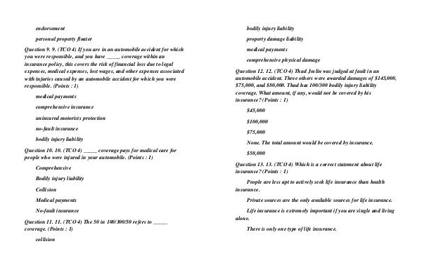 Question 9. 9.( TCO 4) If you are in an automobile accident for which you were responsible, and you have _____ coverage within an insurance policy, this covers the risk of financial loss due to legal expenses, medical expenses, lost wages, and other expenses associated with injuries caused by an automobile accident for which you were responsible.( Points: 1)