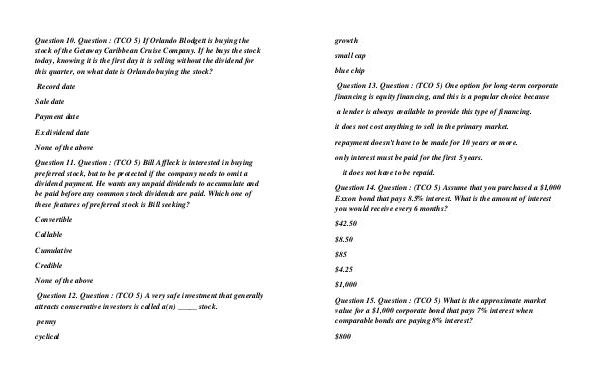 Question 15. Question:( TCO 5) What is the approximate market value for a $ 1,000 corporate bond that pays 7 % interest when comparable bonds are paying 8 % interest?