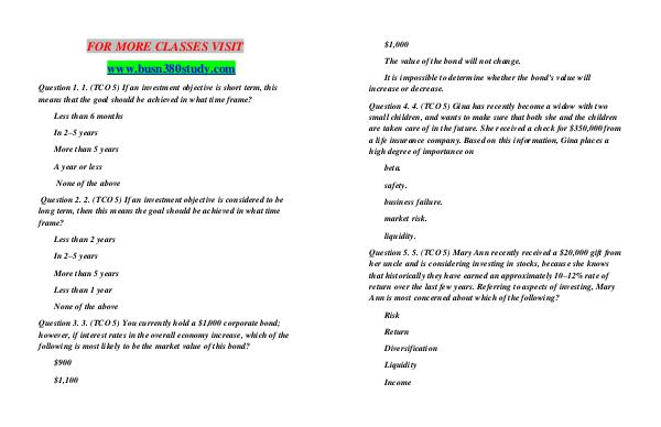 Question 1. 1.( TCO 5) If an investment objective is short term, this means that the goal should be achieved in what time frame?