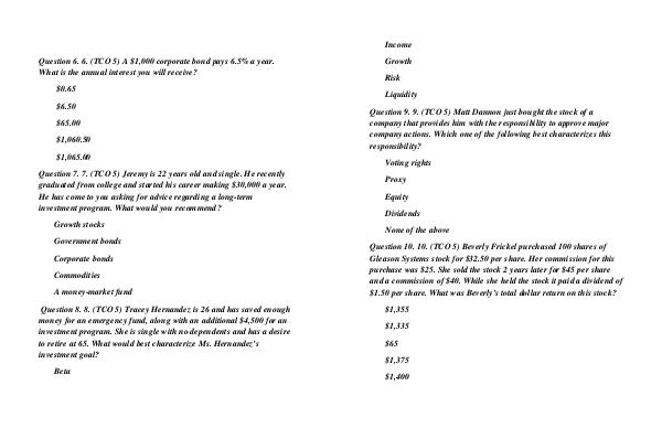 Question 6. 6.( TCO 5) A $ 1,000 corporate bond pays 6.5 % a year. What is the annual interest you will receive?