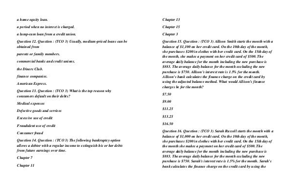 Question 16. Question:( TCO 3) Sarah Russell starts the month with a balance of $ 1,000 on her credit card. On the 10th day of the month, she purchases $ 200 in clothes with her credit card. On the 15th day of the month she makes a payment on her credit card of $ 500. The average daily balance for the month including the new purchase is $ 883. The average daily balance for the month excluding the new purchase is $ 750. Sarah ' s interest rate is 1.5 % for the month. Sarah ' s bank calculates the finance charge on the credit card by using the