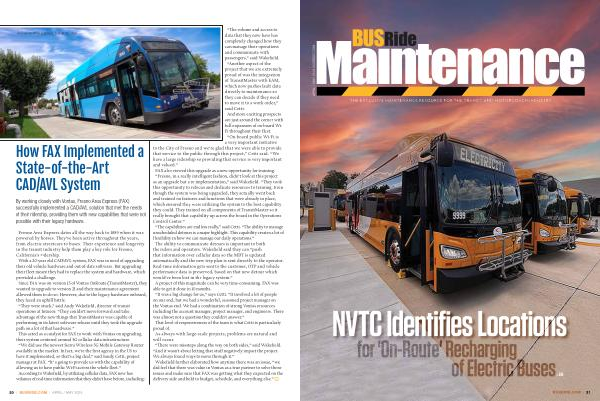 “ The volume and access to data that they now have has completely changed how they can manage their operations and communicate with passengers ,” said Wakefield . “ Another aspect of the project that we are extremely proud of was the integration of TransitMaster with EAM , which now pushes fault data directly to maintenance so they can decide if they need to move it to a work order ,” said Cetti . And more exciting prospects are just around the corner with full expansion of on-board Wi- Fi throughout their fleet . “ On-board public Wi-Fi is a very important initiative to the City of Fresno and we ’ re glad that we were able to provide that service to the public through this project ,” Cetti said . “ We have a large ridership so providing that service is very important and valued .” FAX also viewed this upgrade as a new opportunity for training . “ Fresno , in a really intelligent fashion , didn ’ t look at this project as an upgrade but a re-implementation ,” said Wakefield . “ They took this opportunity to refocus and dedicate resources to training . Even though the system was being upgraded , they actually went back and trained on features and functions that were already in place , which ensured they were utilizing the system to the best capability they could . They trained on all components of TransitMaster so it really brought that capability up across the board in the Operations Control Center .” “ The capabilities are endless really ,” said Cetti . “ The ability to manage unscheduled detours is a major highlight . This capability creates a lot of flexibility in how we can manage our daily operations .” The ability to communicate detours is important to both the riders and operators . Wakefield said they can “ push that information over cellular data so the MDT is updated automatically and the new trip plan is sent directly to the operator . Real-time information gets sent to the customer , OTP and vehicle performance data is preserved , based on that new detour which would ' ve been lost in the legacy system .” A project of this magnitude can be very time-consuming . FAX was able to get it done in 10 months . “ It was a big change for us ,” says Cetti . “ It involved a lot of people on our end , but we had a wonderful , seasoned project manager on the Vontas end . We had a combination of strong Vontas resources including the account manager , project manager , and engineers . There was almost not a question they couldn ' t answer .” That level of responsiveness of the team is what Cetti is particularly proud of . As always with large-scale projects , problems are natural and will occur . “ There were missteps along the way on both sides ,” said Wakefield . “ And it wasn ' t about letting that stuff negatively impact the project . We always found ways to move through it .” Wakefield further elaborated how anytime there was an issue , “ we did feel that there was value in Vontas as a true partner to solve those issues and make sure that FAX was getting what they expected on the delivery side and held to budget , schedule , and everything else .”
