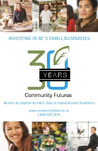 INVESTING IN BC’S SMALL BUSINESSES Access to capital to start, buy or expand your business. www.communityfutures.ca 1.888.303.2232