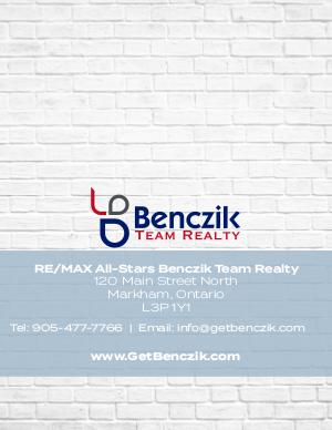 RE/MAX All-Stars Benczik Team Realty 120 Main Street North Markham, Ontario L3P 1Y1 Tel: 905-477-7766 | Email: info@getbenczik.com www.GetBenczik.com