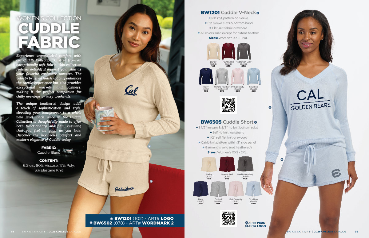 BW6505 Cuddle Short » 3 1 / 2” inseam & 5 / 8” rib knit bottom edge » Self rib knit waistband » 1 / 2” self flat knit drawcord » Cable knit pattern within 3” side panel » Garment is solid( not heathered) Sizes: Women’ s XXS- 2XL