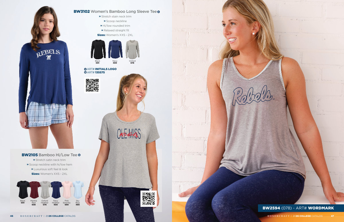 BW3102 Women ' s Bamboo Long Sleeve Tee » Stretch stain neck trim » Scoop neckline » Hi / low rounded trim » Relaxed straight fit Sizes: Women’ s XXS- 2XL