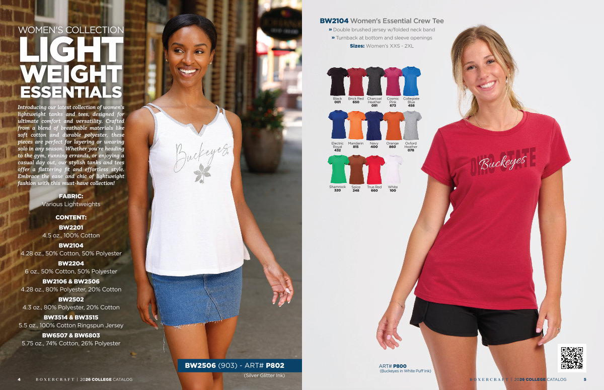 BW2104 Women ' s Essential Crew Tee » Double brushed jersey w / folded neck band » Turnback at bottom and sleeve openings Sizes: Women’ s XXS- 2XL