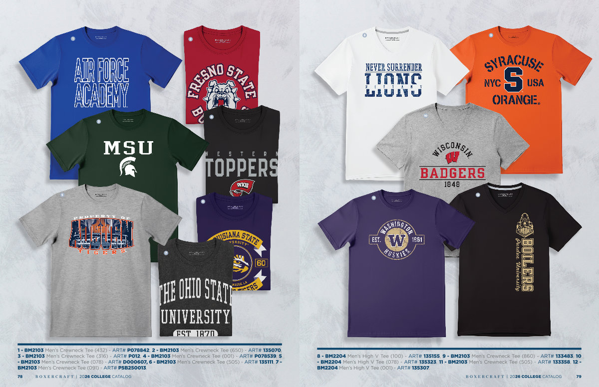8- BM2204 Men’ s High V Tee( 100)- ART # 135155, 9- BM2103 Men’ s Crewneck Tee( 860)- ART # 133483, 10- BM2204 Men’ s High V Tee( 078)- ART # 135323, 11- BM2103 Men’ s Crewneck Tee( 505)- ART # 133358, 12- BM2204 Men’ s High V Tee( 001)- ART # 135307.