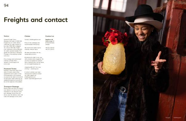General Freight Terms Minimum first order is 2000 SEK. Freight Free on orders above 7500 SEK. An order amount of less than 7500 SEK is shipped for a fee of 450 SEK. Freight cost regulations will be adjusted for orders outside Sweden. The goods are sold only in full packs. Changes in the packing number can occur.