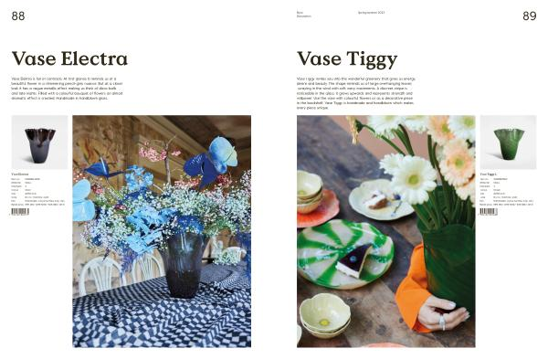 Vase Tiggy invites you into the wonderful greenery that gives us energy , desire and beauty . The shape reminds us of large overhanging leaves swaying in the wind with soft wavy movements . A discreet stripe is noticeable in the glass , it grows upwards and represents strength and willpower . Use the vase with colourful flowers or as a decorative piece in the bookshelf . Vase Tiggy is handmade and handblown which makes every piece unique .
