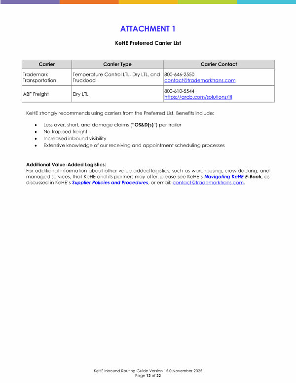 KeHE strongly recommends using carriers from the Preferred List. Benefits include:
