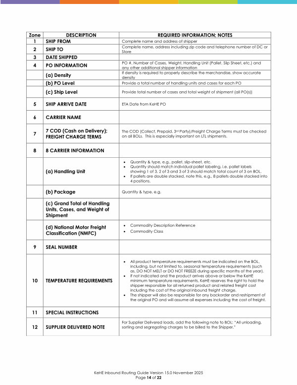 KeHE Inbound Routing Guide Version 15.0 November 2025 Page 14 of 22