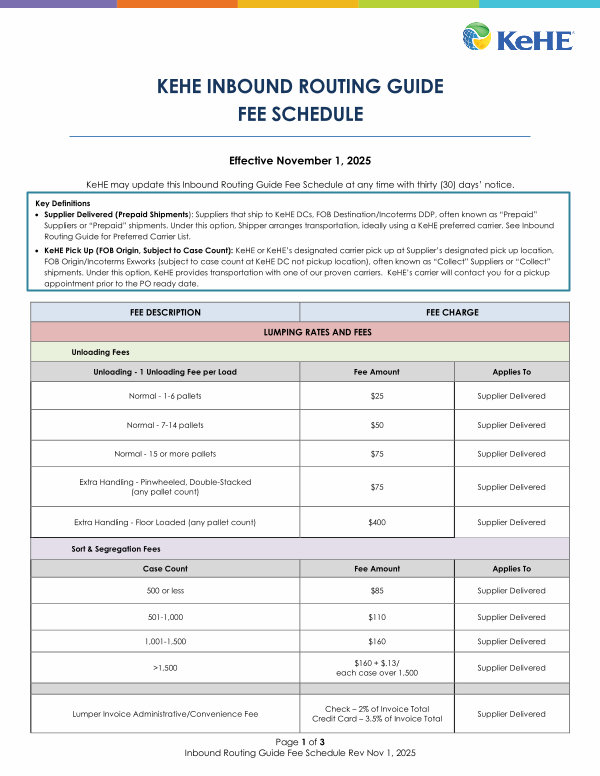 KEHE INBOUND ROUTING GUIDE FEE SCHEDULE