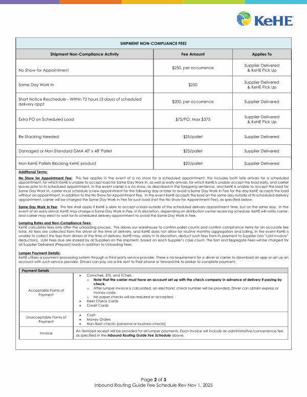 Lumping Rates and Non-Compliance Fees: KeHE calculates fees only after the unloading process. This allows our warehouse to confirm pallet counts and confirm compli ance items for an accurate fee total. All fees are collected from the driver at the time of delivery, and KeHE does not allow for routine monthly aggregation and billing. In the event KeHE is unable to collect the fees from drivers at the time of delivery, KeHE may, solely in its discretion, deduct such fees from its payment to Supplier( via“ LUM Invoice” deduction). LUM Fees due are shared by all Suppliers on the shipment, based on each Supplier’ s case count. The Sort and Segregate Fees will be charged for all Supplier Delivered( Prepaid) loads in addition to Unloading Fees.