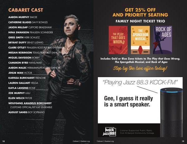 AARON MURPHY EMCEE CATHERINE BLADES SALLY BOWLES JASON MILLSAP CLIFFORD BRADSHAW NINA SWANSON FRAULEIN SCHNEIDER GREG SMITH HERR SCHULTZ BRYANT DUFFY ERNST LUDWIG CLAIRE OTTLEY FRAULEIN KOST / KIT KAT ENSEMBLE MEGAN ROBINSON TEXAS / FEATURED DANCER MIGUEL DAVIDSON BOBBY CAMERON BYRD HANS / MAX AARON MALEC HERMANN / FEATURED DANCER JENUB WAN VICTOR KARISSA BURKHARDT FRENCHIE LAUREN GALLIART HELGA KAYLA LANSING ROSIE ZOE MURPHY LULU ELLEN WELCH FRITZIE