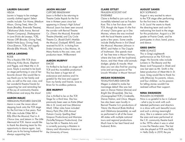 JASON MILLSAP CLIFFORD BRADSHAW Jason is thrilled to be returning to Theatre Cedar Rapids for the first time in thirteen years since last appearing in Disney ’ s High School Musical . Jason has been seen around the corridor with Revival Theatre Co . ( Titanic the Musical ), Riverside Theatre ( Hamlet ), and City Circle Theatre Co . ( Roald Dahl ’ s Matilda the Musical , Godspell , RENT ). Jason received his B . F . A . in Acting from Drake University in Des Moines , IA . Many thanks to the cast , crew , and production team . Willkommen !