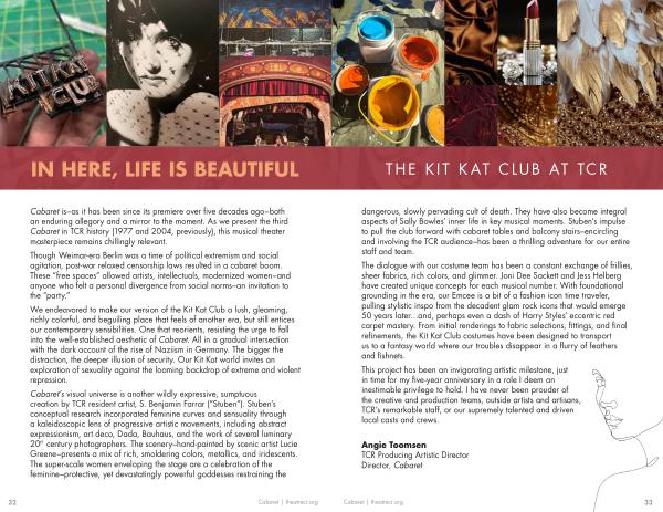 dangerous , slowly pervading cult of death . They have also become integral aspects of Sally Bowles ’ inner life in key musical moments . Stuben ’ s impulse to pull the club forward with cabaret tables and balcony stairs – encircling and involving the TCR audience – has been a thrilling adventure for our entire staff and team .