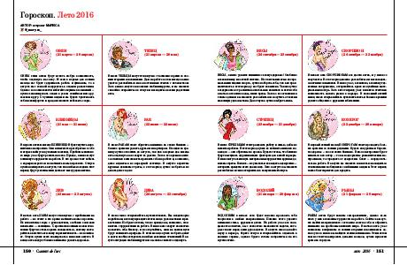 Рыбы летом будут заняты саморазвитием, однако из-за этого у них возможны трудности на работе. Сейчас вам лучше выйти из привычного состояния поиска себя и обратить внимание на проблемы внешнего мира. В начале лета у вас возможны конфликты со своими вторыми половинками, однако уже к июлю вы найдете взаимопонимание. Этим летом вам не стоит планировать дальних поездок, лучше провести время за городом. лето 2016 ▪ 151