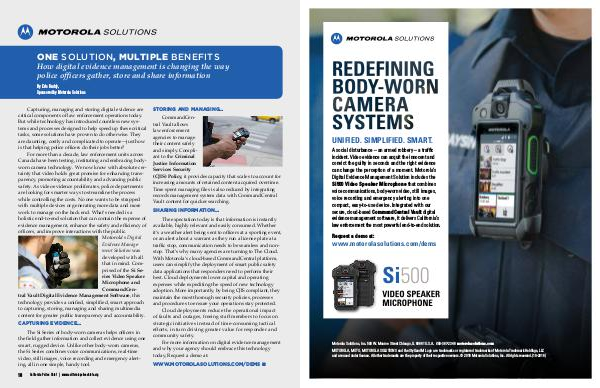 For more than a decade, law enforcement units across Canada have been testing, instituting and embracing bodyworn camera technology. We now know with absolute certainty that video holds great promise for enhancing transparency, promoting accountability and advancing public safety. As video evidence proliferates, police departments are looking for smarter ways to streamline the process while controlling the costs. No one wants to be strapped with multiple devices or generating more data and more work to manage on the back end. What’ s needed is a holistic end-to-end solution that can contain the expense of evidence management, enhance the safety and efficiency of officers, and improve interactions with the public. Motorola’ s Digital Evidence Management Solution was developed with all that in mind. Comprised of the Si Series Video Speaker Microphone and CommandCentral Vault Digital Evidence Management Software, this technology provides a unified, simplified, smart approach to capturing, storing, managing and sharing multimedia content for greater public transparency and accountability.