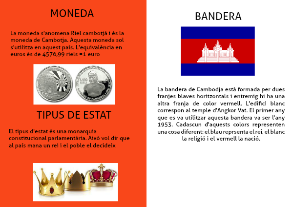 La moneda s'anomena Riel cambotjà i és la moneda de Cambotja. Aquesta moneda sol s'utilitza en aquest país. L'equivalència en euros és de 4576,99 riels =1 euro