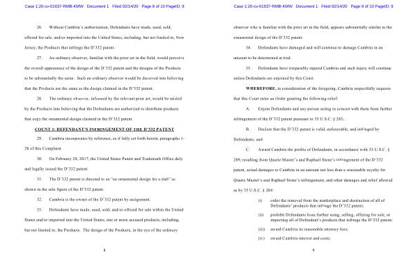 28 of this Complaint . 30 . On February 28 , 2017 , the United States Patent and Trademark Office duly and legally issued the D ’ 332 patent . 31 . The D ’ 332 patent is directed to an “ an ornamental design for a slab ” as shown in the sole figure of the D ’ 332 patent . 32 . Cambria is the owner of the D ’ 332 patent by assignment . 33 . Defendants have made , used , sold , and / or offered for sale within the United States and / or imported into the United States , one or more accused products , including , but not limited to , the Products . The design of the Products , in the eye of the ordinary