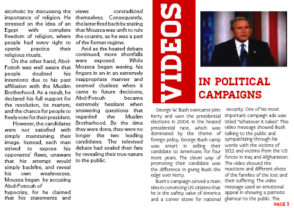 security. One of his most important campaign ads was titled “Whatever it takes”. This video message showed Bush talking to the public and sympathizing through his words with the victims of 9/11 and victims from the US forces in Iraq and Afghanistan. The video showed the reactions and different shots of the families of the lost and their suffering. The video message used an emotional appeal in showing a patriotic glamour to the public. The