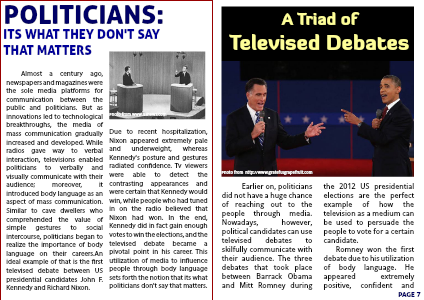 Almost a century ago, newspapers and magazines were the sole media platforms for communication between the public and politicians. But as innovations led to technological breakthroughs, the media of mass communication gradually increased and developed. While radios gave way to verbal interaction, televisions enabled politicians to verbally and visually communicate with their audience; moreover, it introduced body language as an aspect of mass communication. Similar to cave dwellers who comprehended the value of simple gestures to social intercourse, politicians began to realize the importance of body language on their careers.An ideal example of that is the first televised debate between US presidential candidates John F. Kennedy and Richard Nixon.