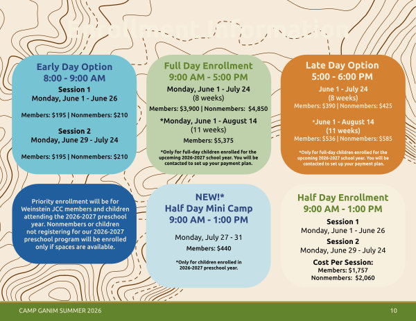Priority enrollment will be for Weinstein JCC members and children attending the 2026-2027 preschool year. Nonmembers or children not registering for our 2026-2027 preschool program will be enrolled only if spaces are available.