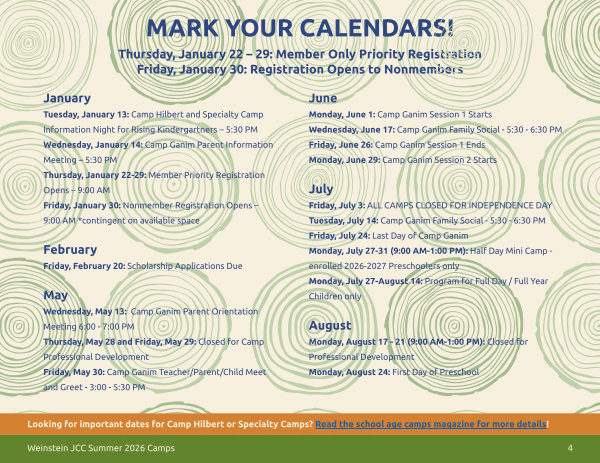 Tuesday, January 13: Camp Hilbert and Specialty Camp Information Night for Rising Kindergartners – 5:30 PM Wednesday, January 14: Camp Ganim Parent Information Meeting – 5:30 PM Thursday, January 22-29: Member Priority Registration Opens – 9:00 AM Friday, January 30: Nonmember Registration Opens – 9:00 AM * contingent on available space