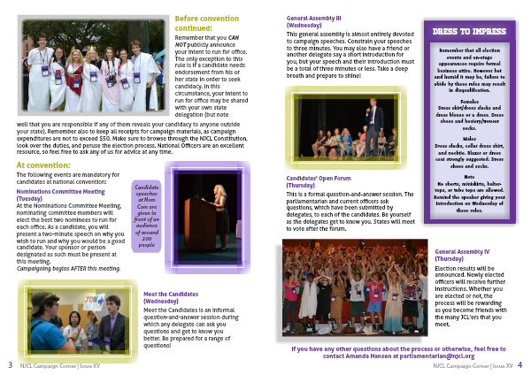 Remember that all election events and on-stage appearances require formal business attire. However hot and humid it may be, failure to abide by these rules may result in disqualification.