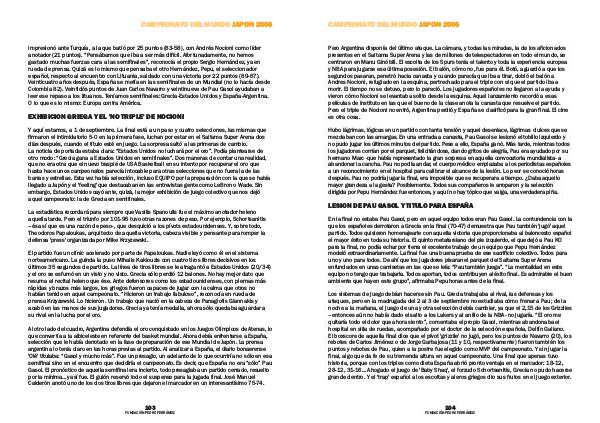 En la final no estaba Pau Gasol, pero en aquel equipo todos eran Pau Gasol. La contundencia con la que los españoles derrotaron a Grecia en la final( 70-47) demuestra que Pau también ' jugó ' aquel partido. Todos quisieron homenajearle con aquella victoria que proporcionaba al baloncesto español el mayor éxito en toda su historia. El quinto metatarsiano del pie izquierdo, el que dejó a Pau KO para la final, no podía echar por tierra el excelente trabajo de un equipo que Pepu Hernández modeló extraordinariamente. La final fue una buena prueba de ese sacrificio colectivo. Todos para uno y uno para todos. De ahí que los jugadores pisaran el parquet del Saitama Super Arena enfundados en unas camisetas en las que se leía:“ Pau también juega”.“ La mentalidad en este equipo no tengo que trabajarla. Todos aportan, todos contribuyen al éxito final. Es admirable el buen ambiente que hay en este grupo”, afirmaba Pepu horas antes de la final.