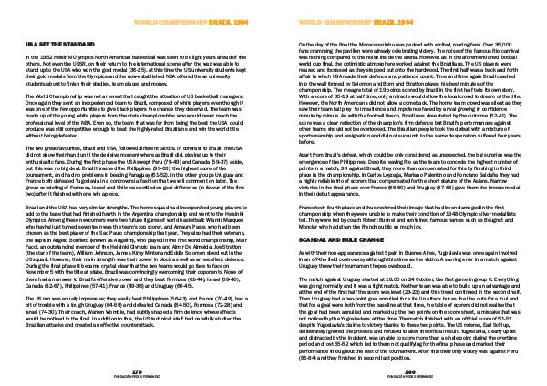 The two great favourites, Brazil and USA, followed different tactics. In contrast to Brazil, the USA did not show their hand until the decisive moment whereas Brazil did, playing up to their enthusiastic fans. During the first phase the USA swept Peru( 79-49) and Canada( 59-37) aside, but this was no big deal. Brazil thrashed the Philippines( 99-63), the highest score of the tournament, and had no problems in beating Paraguay( 61-52). In the other groups Uruguay and France both defeated Yugoslavia in a controversial fashion that we will comment on later. The group consisting of Formosa, Israel and Chile was settled on goal difference( in favour of the first two) after it finished with one win apiece.