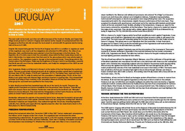 Despite this request being granted the fact that Uruguay was still in no condition to organise an event of this magnitude was clear to all the delegations who attended the fifth edition. The cities of Las Mercedes, Salto and Montevideo were selected to host the three groups in the first phase. The Argentine city of Cordoba was to hold the consolation phase while the final medal phase would be held in Montevideo in a larger arena than that used for the group phase which was unfortunately in poor condition. The organisers made no change to the tournament format. Three things stick in the memory about the first phase. Firstly was the toughness of Group A, held in Las Mercedes, secondly that Brazil was still one of the top basketball nations, and finally the emergence of the USSR as real gold medal candidates.