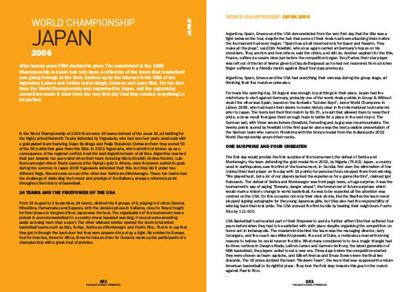 The first day would provide the first surprise of the tournament, the defeat of Serbia and Montenegro, the team defending the gold medal from 2002, by Nigeria( 75-82). Japan, a country used to earthquakes, saw the first of the tournament, in Sendai. Not even the elimination of Ime Udoka( their best player on the day with 18 points) for personal fouls stopped them from winning.“ We played hard, but a lot of our players lacked the experience for a game like this”, claimed Igor Rakocevic. The defeat of Serbia and Montenegro was front page news, a huge surprise. It was the tournament ' s way of saying“ Beware, danger ahead”, the forerunner of future surprises which would mark a historic change in world basketball. As was to be expected all the attention was centred on the USA. On this occasion not only their stars shone, like the Beatles the team never stopped signing autographs for the young Japanese girls, but they also had the responsibility of winning back their lost pride. The USA crossed the first hurdle by beating their neighbours Puerto Rico by 111-100.