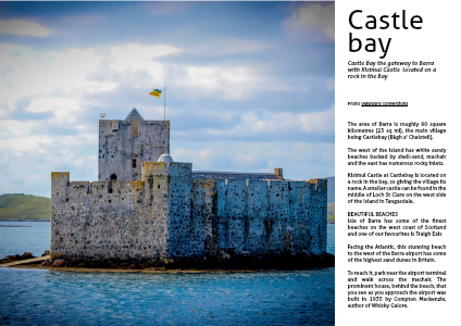Kisimul Castle at Castlebay is located on a rock in the bay, so giving the village its name. A smaller castle can be found in the middle of Loch St Clare on the west side of the Island in Tangasdale.