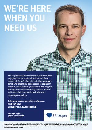WE’RE HERE WHEN YOU NEED US We’re passionate about each of our members enjoying the exceptional retirement they dream of. So we’re here to help them prepare for it. Our members have access to excellent service, quality advice, education and support through our award-winning contact centre * , national advice network, website and on-campus centres. Take your next step with confidence. Find out how: unisuper.com.au/exceptional Matt Ladner | Member Manager, Financial Accounting The University of Melbourne Prepared by UniSuper Management Pty Ltd (ABN 91 006 961 799, AFSL 235 907) on behalf of UniSuper Limited (ABN 54 006 027 121, AFSL 492806) the trustee of UniSuper (ABN 91 385 943 850). This information is of a general nature only. Before making any decision in relation to your UniSuper membership, you should consider your personal circumstances, the relevant product disclosure statement for your membership category and whether to consult a qualified financial adviser. Past performance is not an indicator of future performance. *The Auscontact Association awarded UniSuper the VIC Contact Centre Award and VIC Innovation Award in 2016. Visit unisuper.com.au/awards for more information.