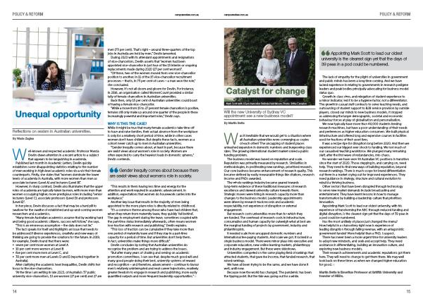 “ Many female Australian academics assume that by working hard and being good academic citizens , success will follow ,” she says . “ This is an erroneous assumption – the data does not lie .” The fact speaks for itself and highlights an issue that needs to be addressed if diverse experiences , creativity and new ways of thinking are going to provide the solutions for the future . In 2019 , for example , Devlin found that there were : ∞ seven per cent more women at Level A ∞ 10 per cent more women at Level B ∞ five per cent more men at Level C , and ∞ 30 per cent more men at Levels D and E ( reported together in Australia ). After clarifying the academic level inequalities , Devlin shifts her focus to the vice-chancellors . “ At the time I am writing in late 2020 , of Australia ’ s 37 public university vice-chancellors , 10 are women ( 27 per cent ) and 27 are men ( 73 per cent ). That ’ s right – around three-quarters of the top jobs in Australia are held by men ,” Devlin lamented .