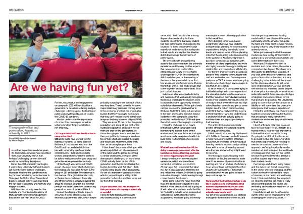 CR : Do you think 2020 was devoid of fun in many universities ? SM : 2020 might have worked well for individual students . So being based in Brisbane , if I ’ m a student who is on the Gold Coast , has a relatively full-time job , with some fairly significant social commitments , I think 2020 probably worked all right for you with the ability to be able to really personalise your study and get online when you wanted to study .