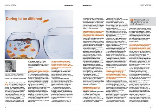 How is Essex University trying to be distinctive and stand out from other universities in the UK ? I think the UK system is very homogenous , certainly more homogenous than the Australian system . And it ’ s been homogenous since the ending of the Polytechnic system in 1992 , and it ’ s becoming increasingly homogenous with a very similar view as to what excellence looks like for most UK universities .